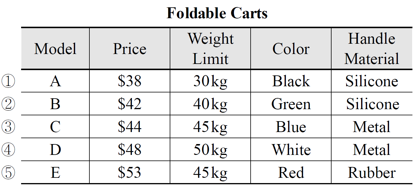 10. 다음 표를 보면서 대화를 듣고, 남자가 주문할 접이식 카트를 고르시오.