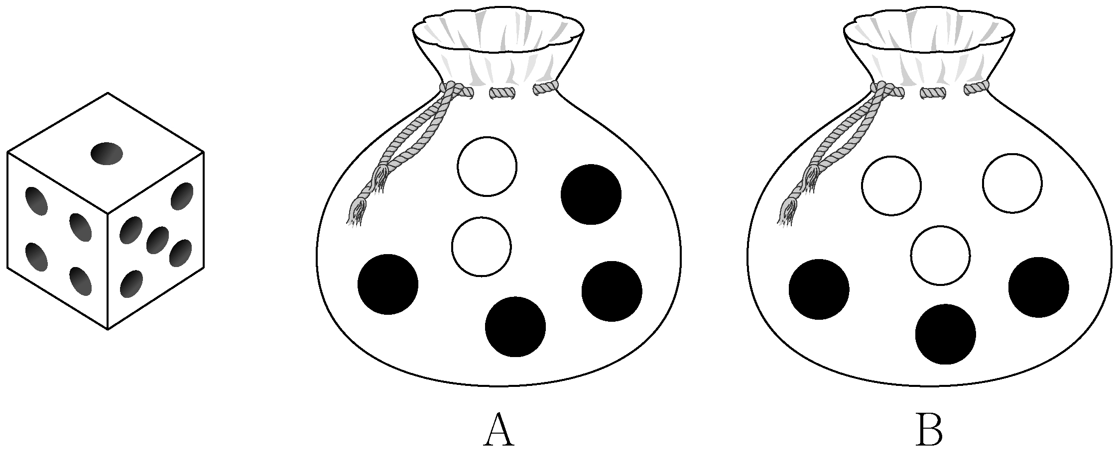 2 . 주머니 A에는 흰 공 2개, 검은 공 4개가 들어 있고, 주머니 B에는 흰 공 3개, 검은 공 3개가 들어 있다. 두 주머니 A, B와 한 개의 주사위를 사용하여 다음 시행을 한다.