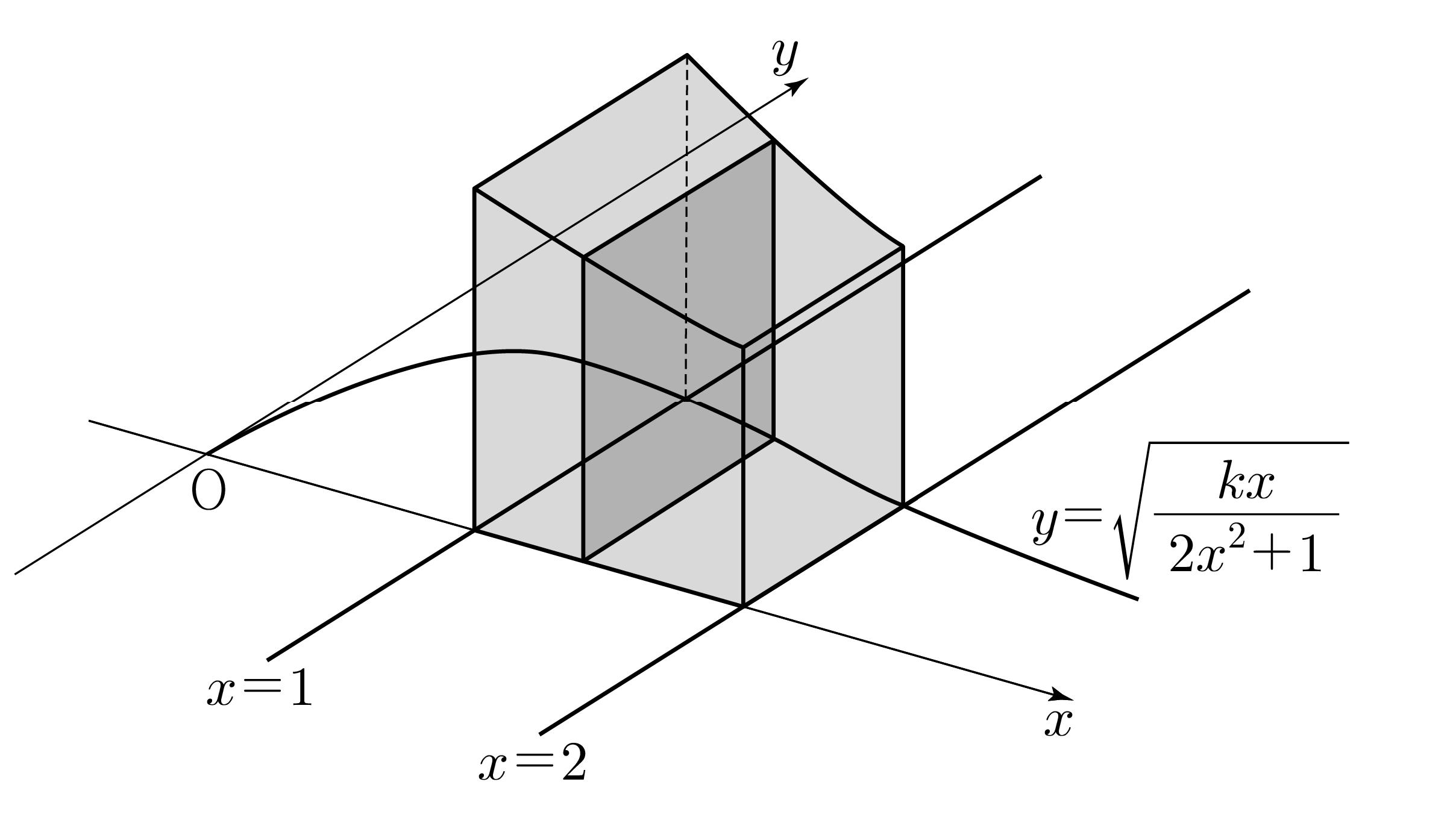 2 . 그림과 같이 양수 \( k \)에 대하여 곡선 \( y = \sqrt{\displaystyle \frac{kx}{2x^2+1}} \)와 \( x \)축 및 두 직선\( x=1, x=2 \)로 둘러싸인 부분을 밑면으로 하고 \( x \)축에 수직인 평면으로 자른 단면이 모두 정사각형인 입체도형의 부피가 \( 2 \ln{3} \)일 때, \( k \)의 값은? [3점]